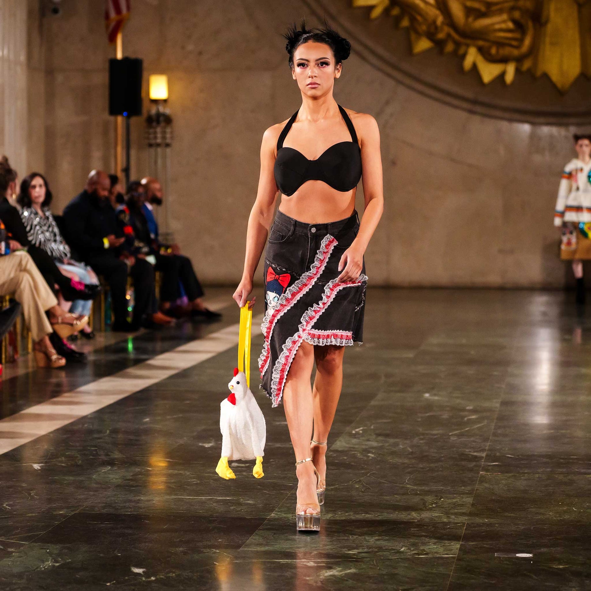 Turn heads with the audacious and statement-making Urban Chic Poultry Skirt Ensemble, exclusively from CLJ Paris. This avant-garde piece captures the essence of unconventional street style with its bold lace and patchwork details, accented by playful chicken embellishments that demand attention. The sleek, fitted black bralette pairs flawlessly with the high-waisted denim skirt, crafting an edgy yet sophisticated silhouette. It's a fearless fusion of farmyard fun and urban fashion — for the trendsetter who's not afraid to strut an eclectic look.